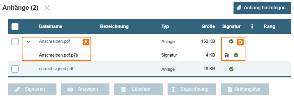 Markieren A Sie nun in der Tabelle einen oder mehrere Anhänge und klicken Sie auf die Schaltfläche "Signieren" B. Die Schaltfläche ist nur sichtbar, solange alle ausgewählten Anhänge unsigniert sind.