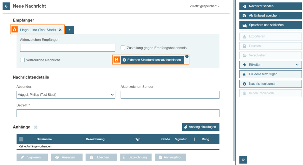 Fügen Sie dem Nachrichtenentwurf einen oder mehrere Empfänger A hinzu. Es öffnet sich für jeden Empfänger ein neuer Reiter mit empfängerspezifischen Eingabefeldern.