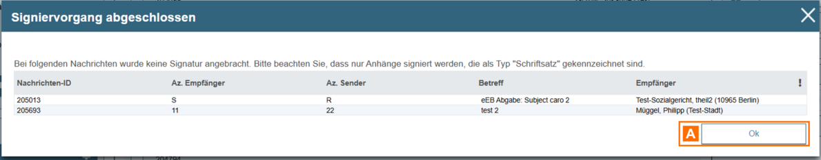 Wurden alle Anhänge (Schriftsätze) der ausgewählten Nachrichten erfolgreich signiert, wird Ihnen eine Bestätigung angezeigt.