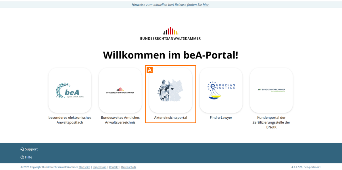 Das Akteneinsichtsportal ist über einen Link im beA-Portal A oder direkt über die Internetseite https://www.akteneinsichtsportal.de/ erreichbar.