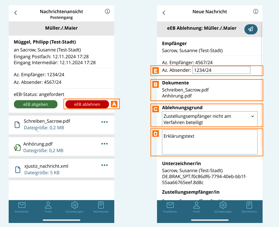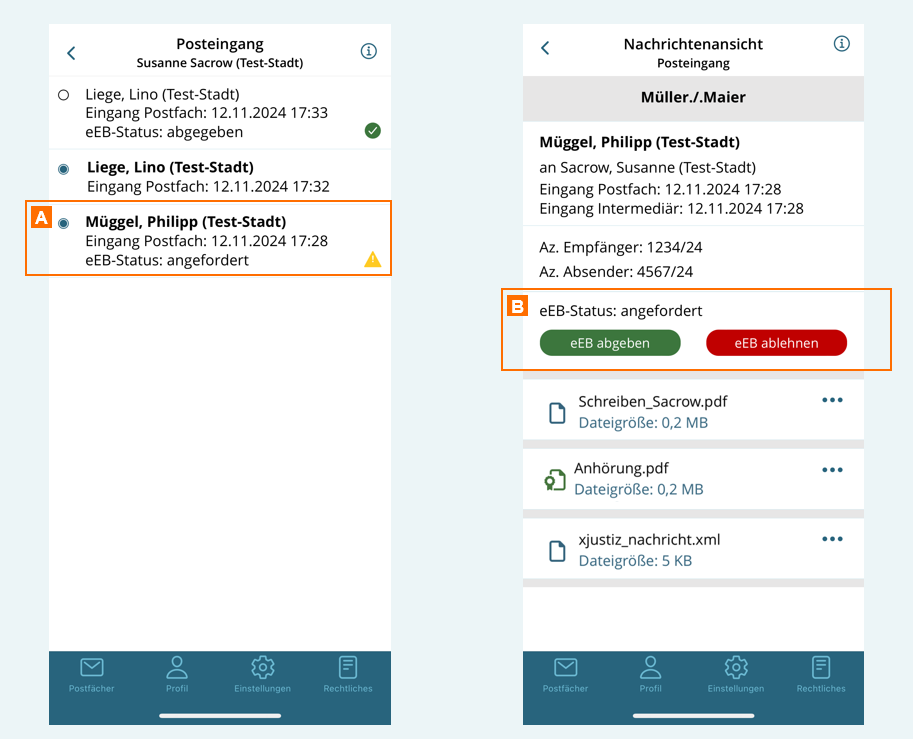 In der geöffneten Nachricht werden zwei Schaltflächen B zur Abgabe oder Ablehnung des eEB angezeigt.